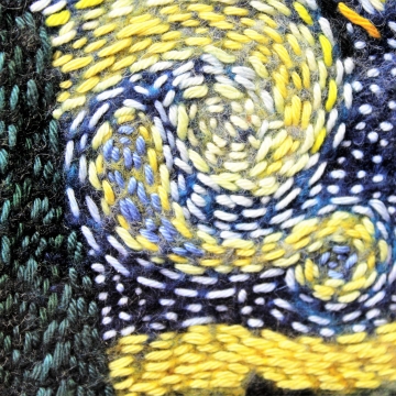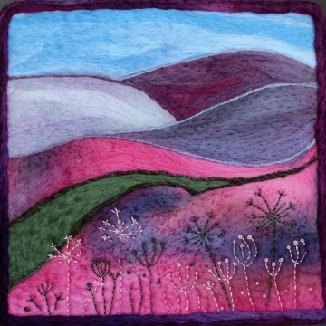 Obraz vytvořený technikou suchého plstění ovčího rouna zdobený výšivkou.