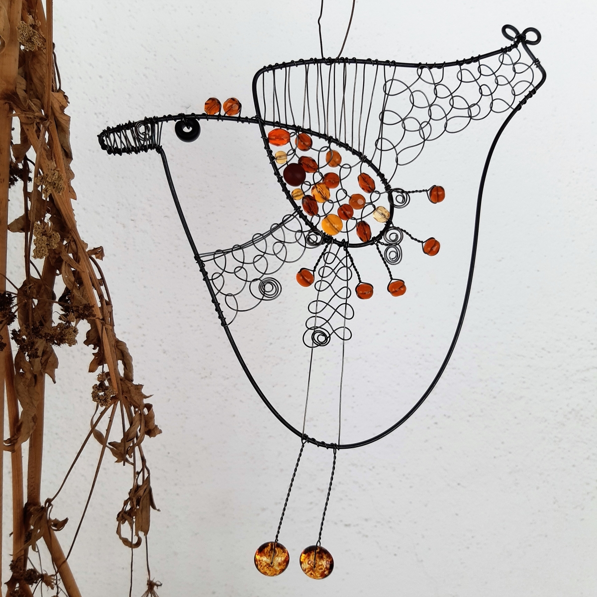 Materiál: černý žíhaný železný drát a české skleněné korálky