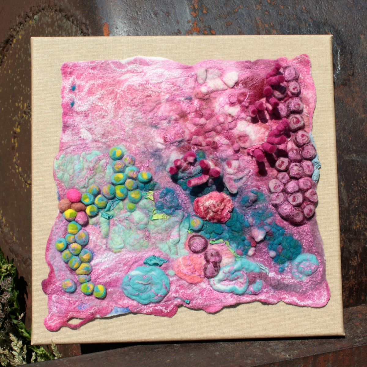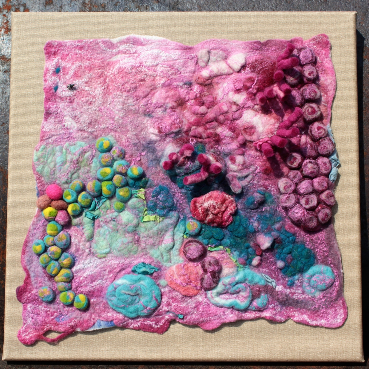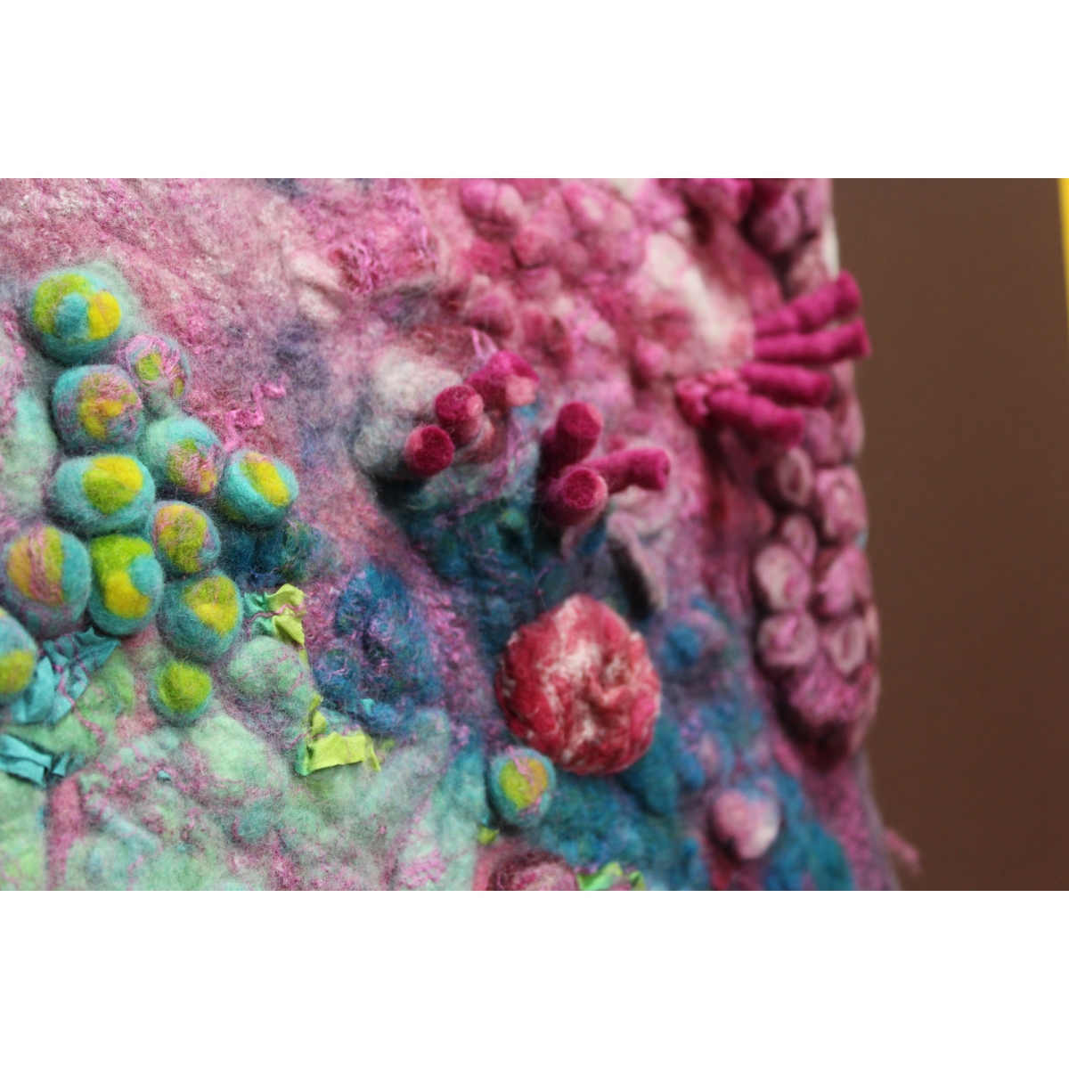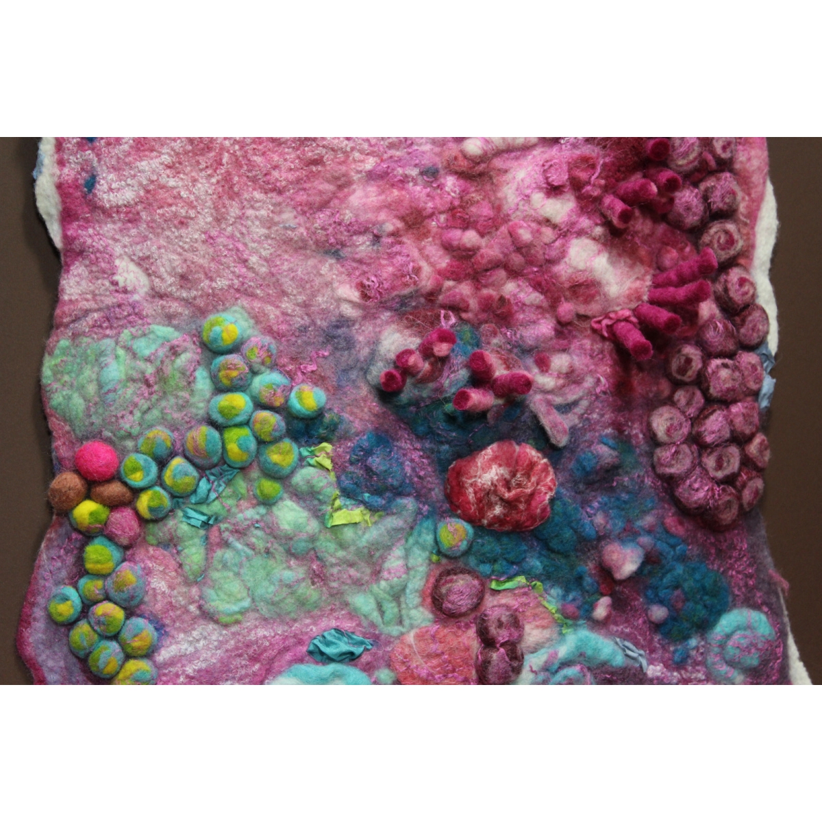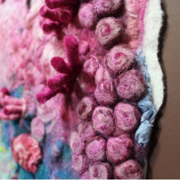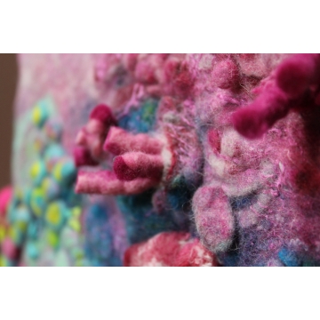 Asambláž zhotovená kombinovanou technikou mokrého a suchého plstění ovčího rouna.