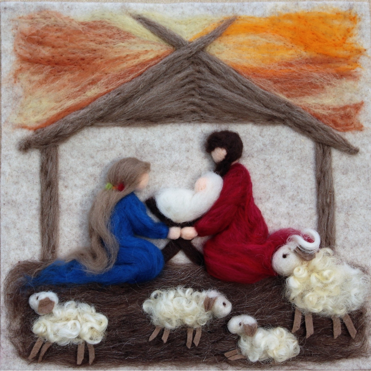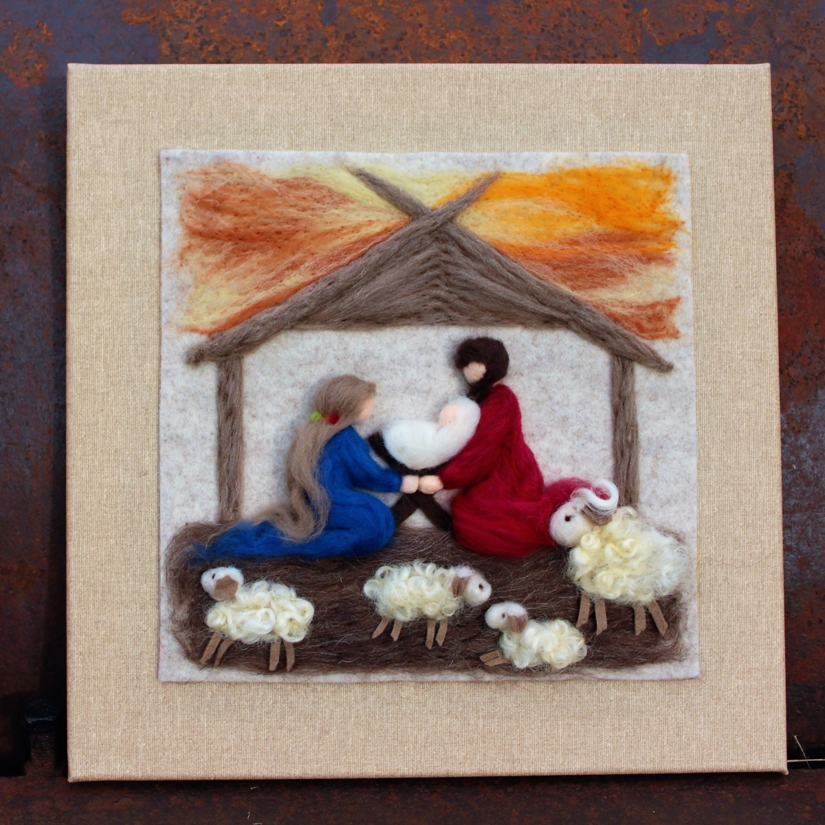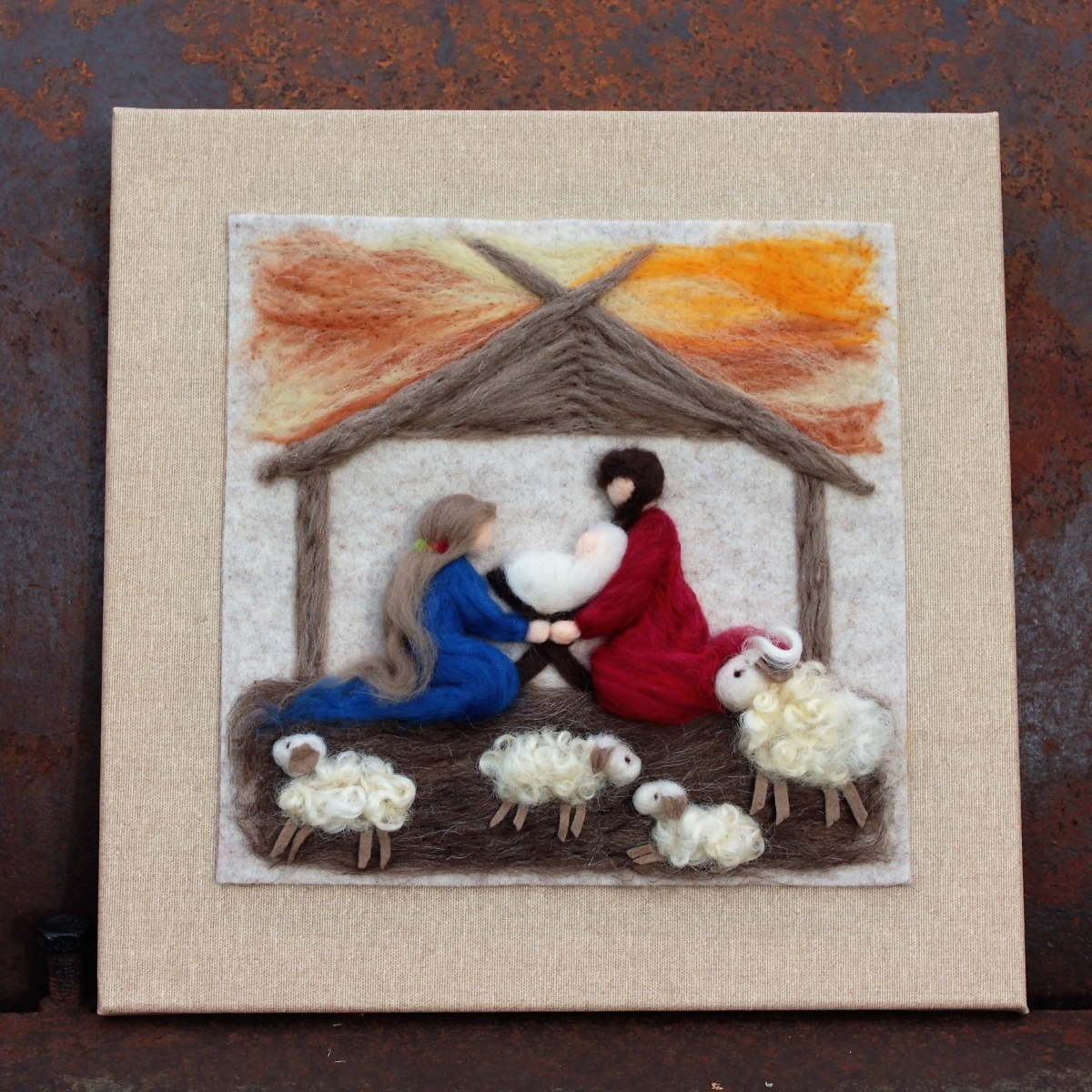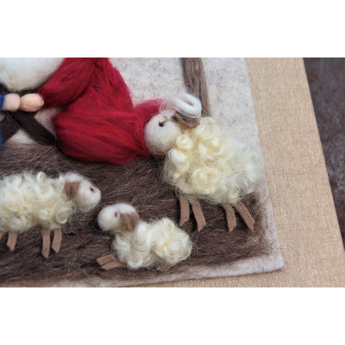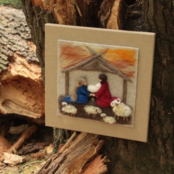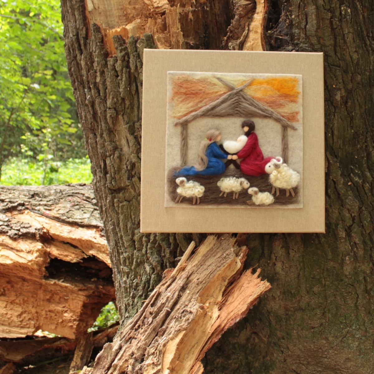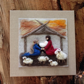 Obraz vytvořený technikou suchého plstění ovčího rouna zdobený výšivkou.