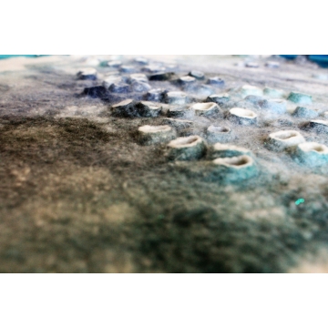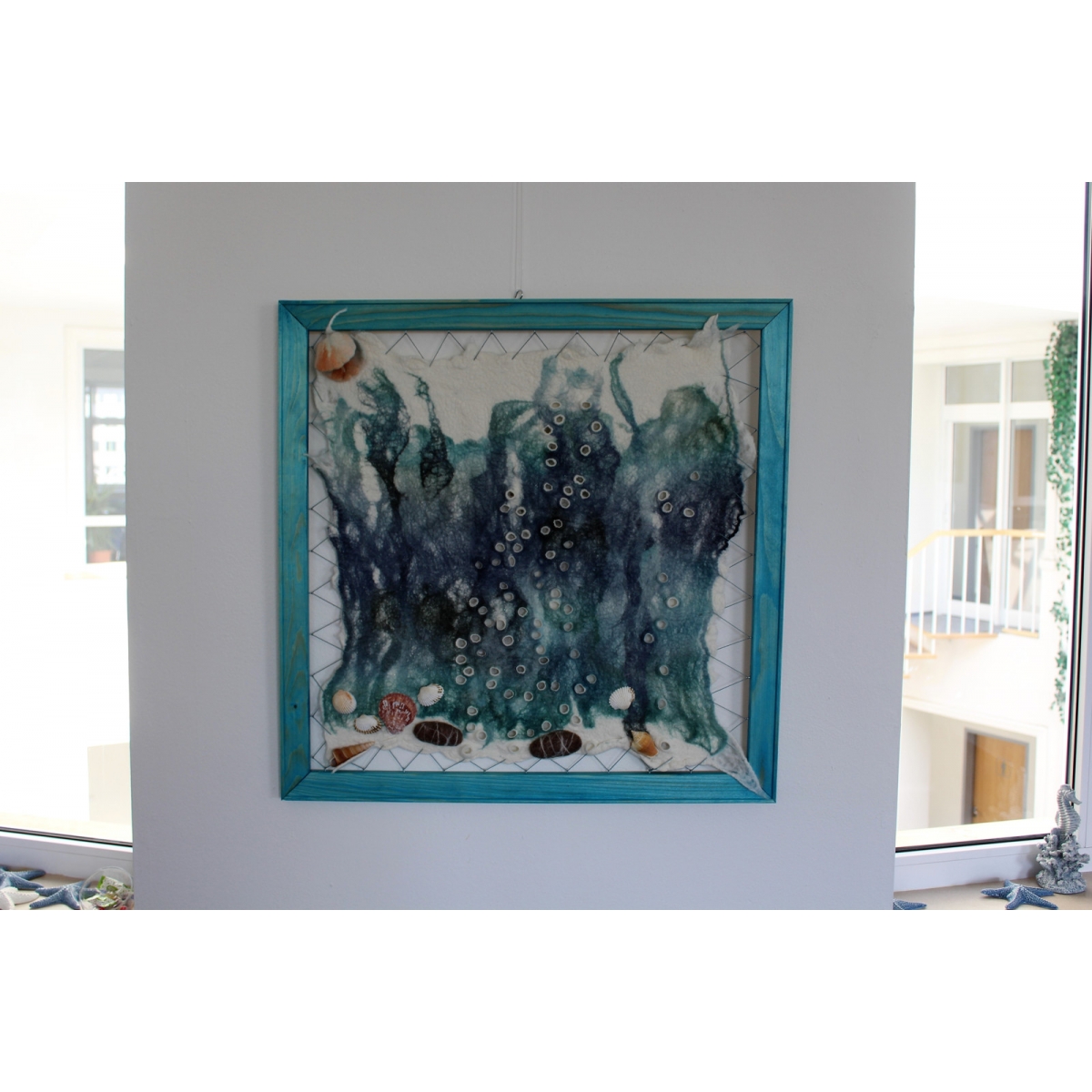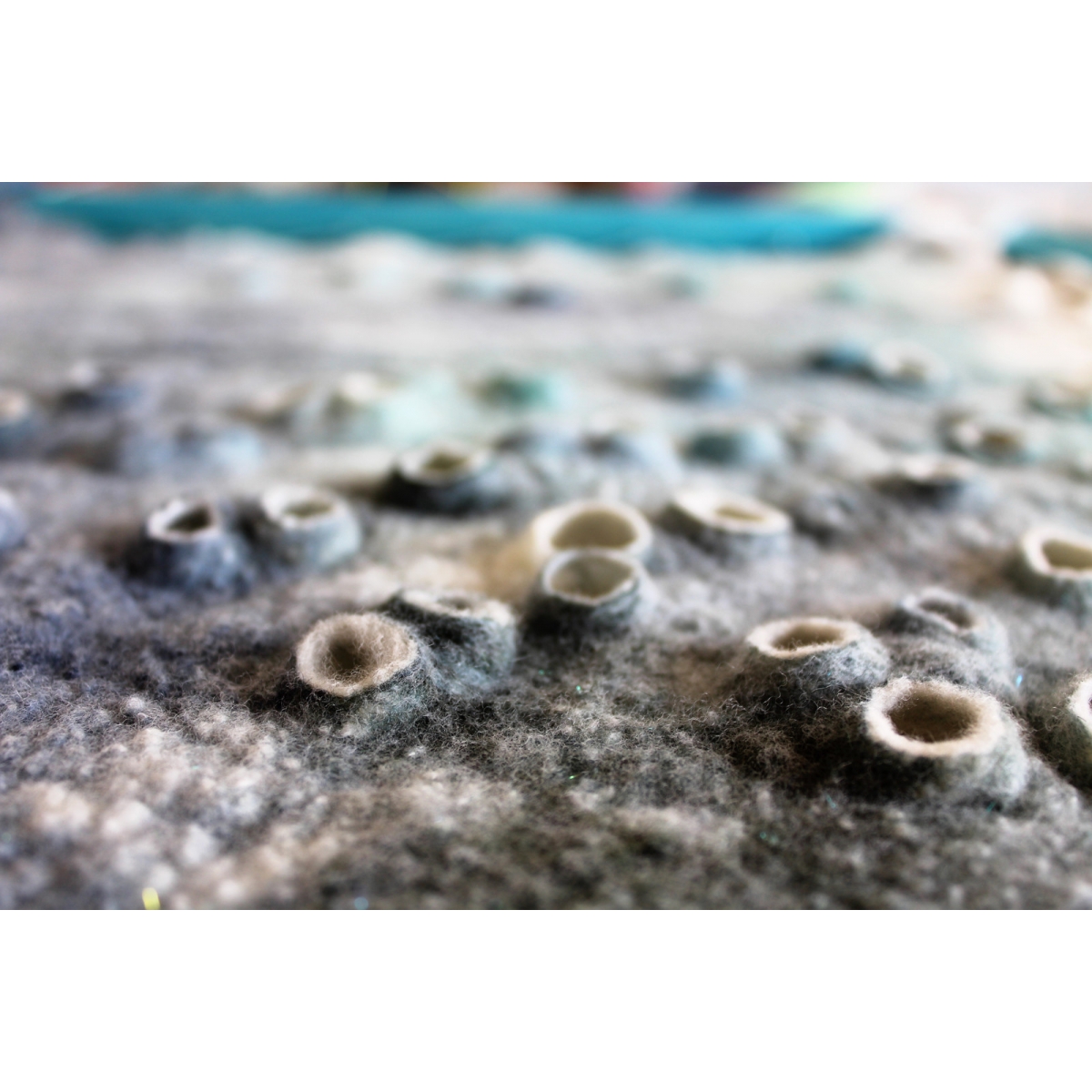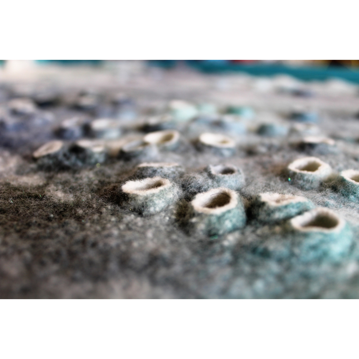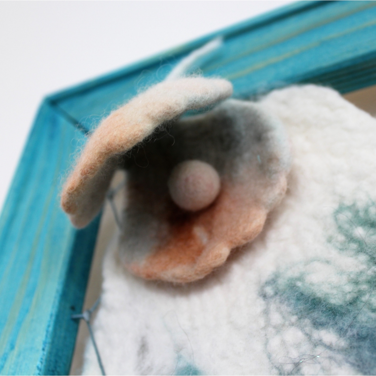 Asambláž zhotovená kombinovanou technikou mokrého a suchého plstění ovčího rouna usazená v dřevěném rámu.