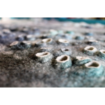Asambláž zhotovená kombinovanou technikou mokrého a suchého plstění ovčího rouna zdobená výšivkou.