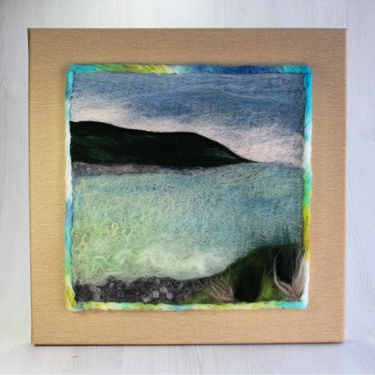 Obraz vytvořený technikou suchého plstění ovčího rouna zdobený výšivkou.