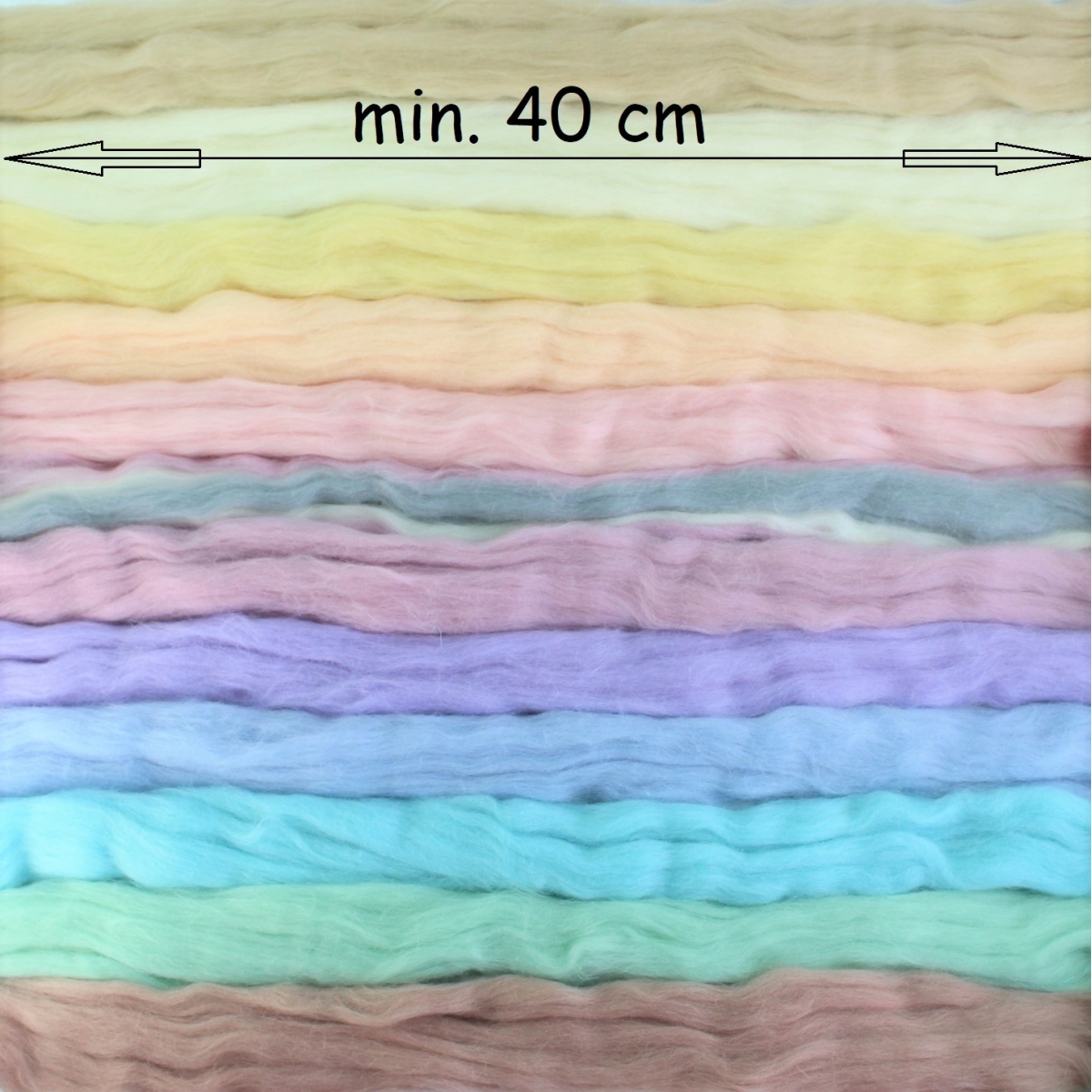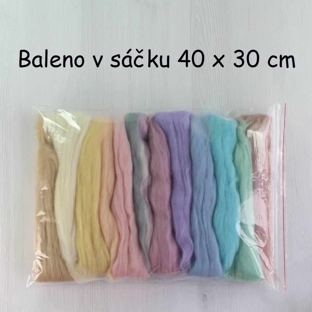 Z každej farby pruh dlhý 40 cm, spolu teda 4,8 metra ovčej vlny na rôzne kreatívne techniky.